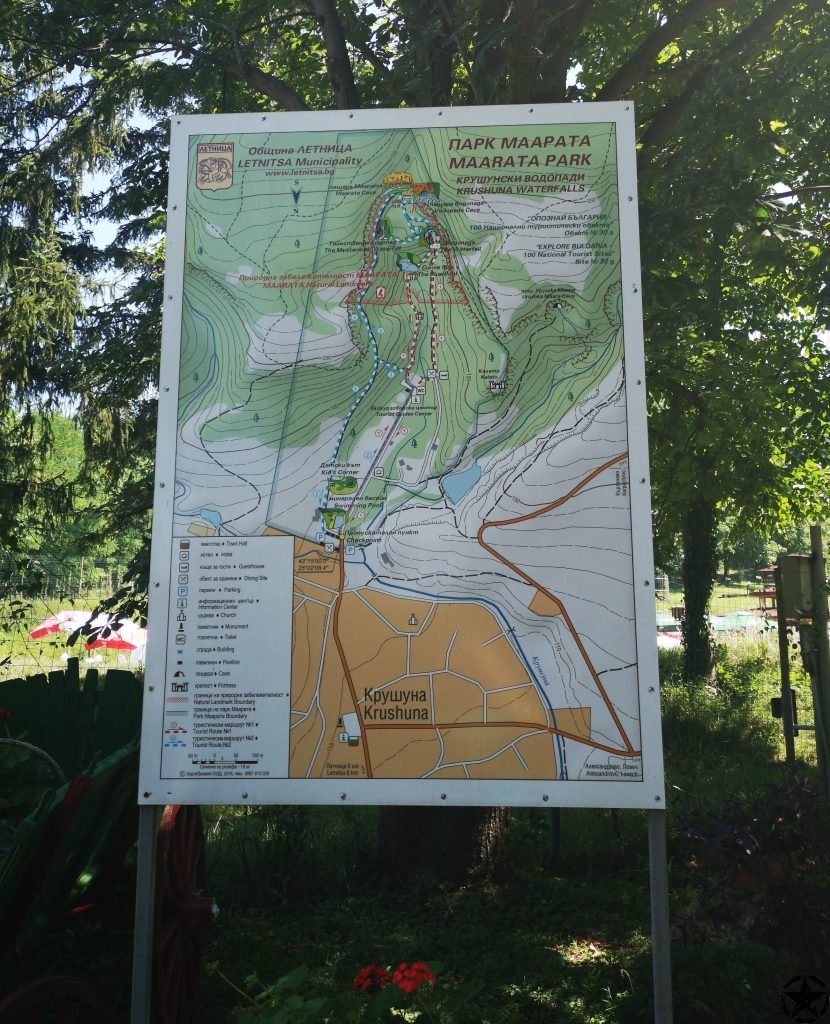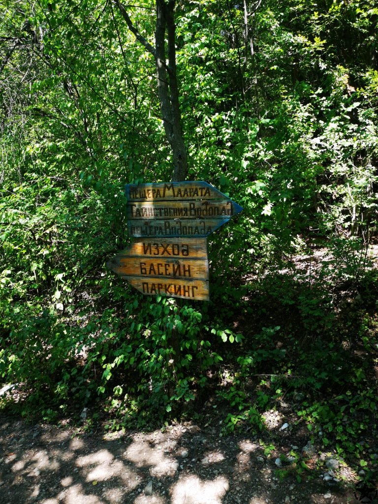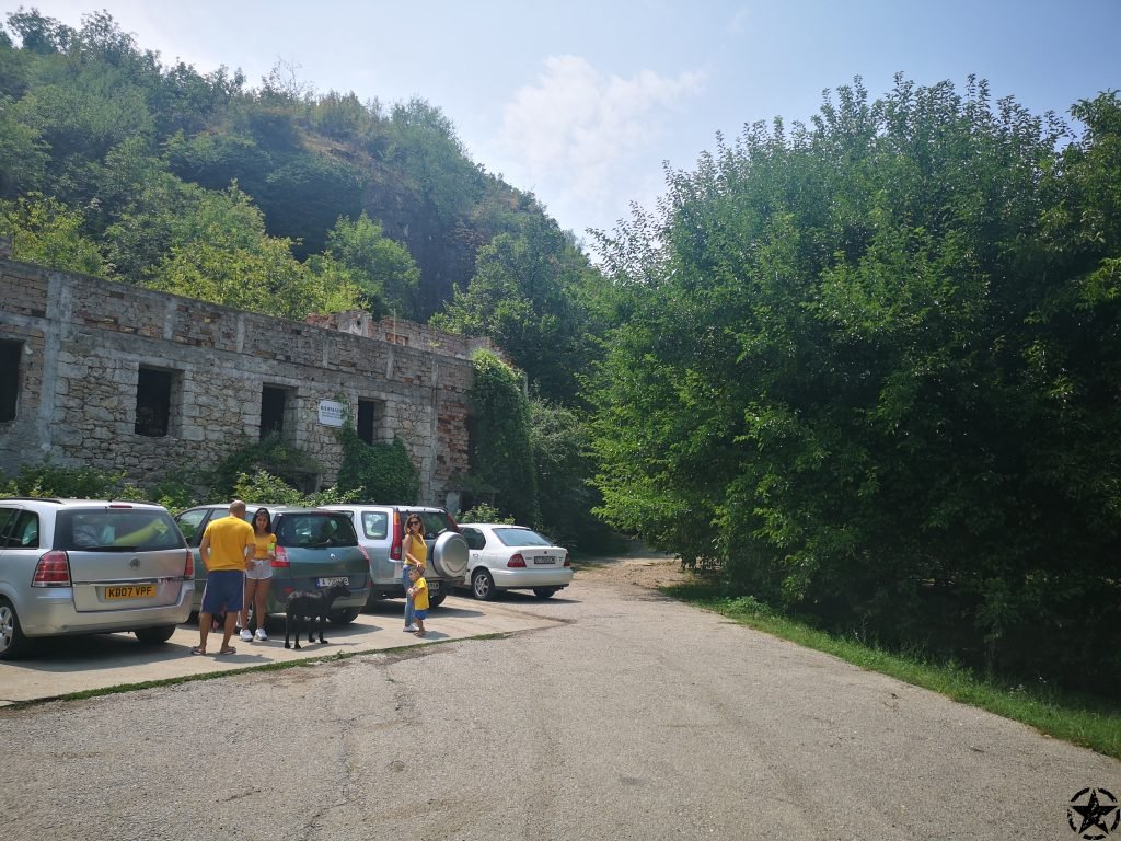 Parcam masina in zona verde din fata portii de intrare in parc apoi achitam biletele de intrare: 3 leva/adult. Trecem de porti iar in partea din stanga vedem o zona imprejmuita cu piscina, sezloguri si umbrele, semn ca locul este folosit pe post de strand de catre localnici si turisti. Mergem 200 m pe drumul asfaltat, trecem de un hotel, pana ajungem in ceea ce cred ca era vechea parcare iar in coltul din stanga vedem punctul de plecare a doua trasee: in stanga traseu albastru catre grote si o cascada mica iar in dreapta traseu rosu catre cascada mare.