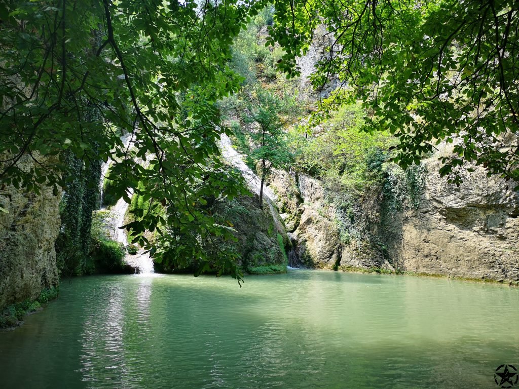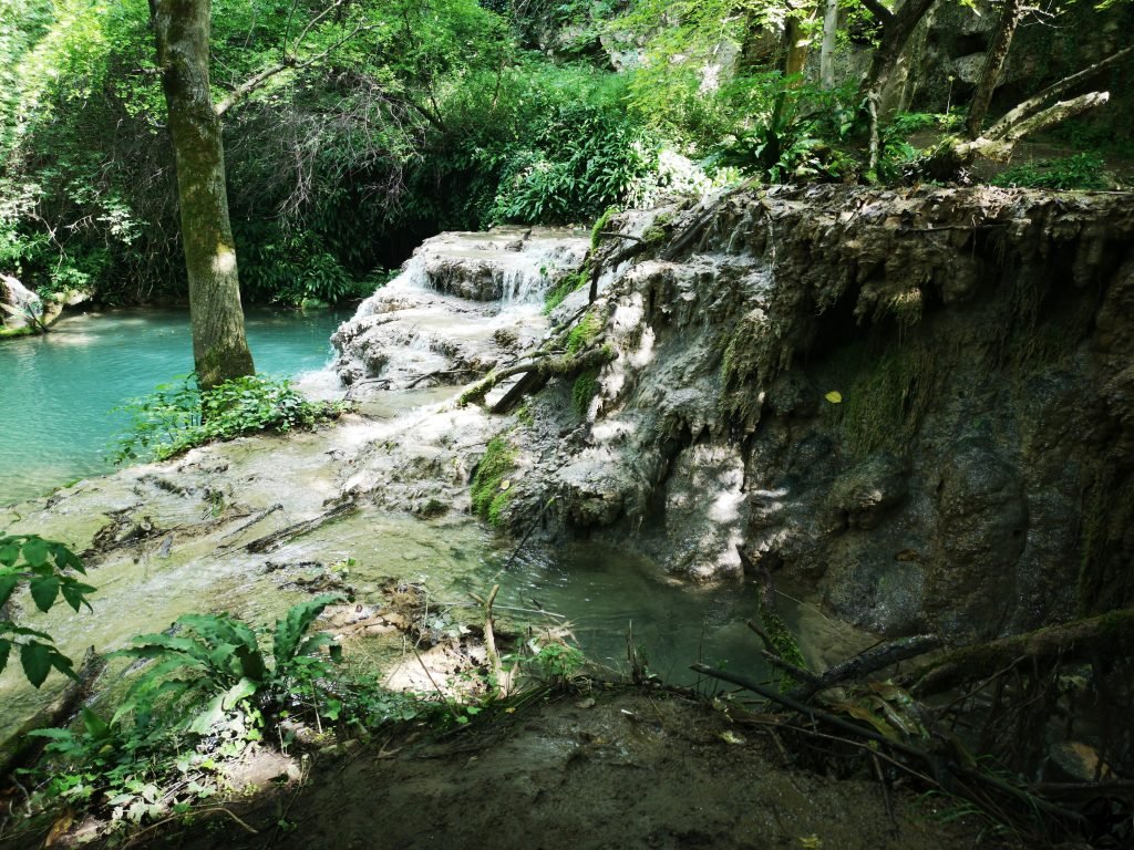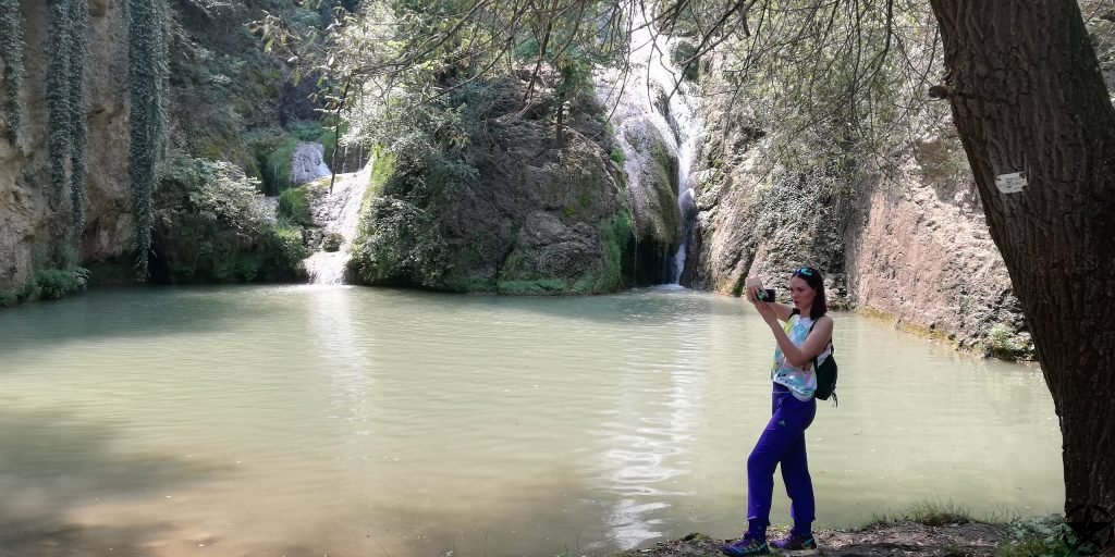 Ne curatam de namolul de pe talpi si ne intoarcem pe acelasi traseu. Stim ca nu putem ajunge direct la cascada mare asa ca facem cale intoarsa pana la parcarea veche de unde urcam lin paralel cu raul catre cascada. Incepem sa vedem piscine naturale formate in calcar, The Blue Pool, insa culoarea apei e departe de albastru ci mai degraba un verzui deschis opalescent. Traversam podul, mai urcam putin, iar un pod si vedem cascada mare Bogonaga (cascada in limba bulgara) cu o cadere de 15 – 20 m. In susul cascadei observam niste oameni insa la o inspectie mai atenta descoperim ca au intrat pe traseul vechi interzis si renuntam la ideea de a mai incalca iar regulile. In trecut scaldatul era permis si cred ca era o adevarata placere sa te bucuri de cantecul cascadei, racoarea apei si culoarea feerica a acesteia. Facem cateva poze, ne imaginam cum ar fi fost scaldatul acolo si continuam traseul rosu, lin de intoarcere prin padure.