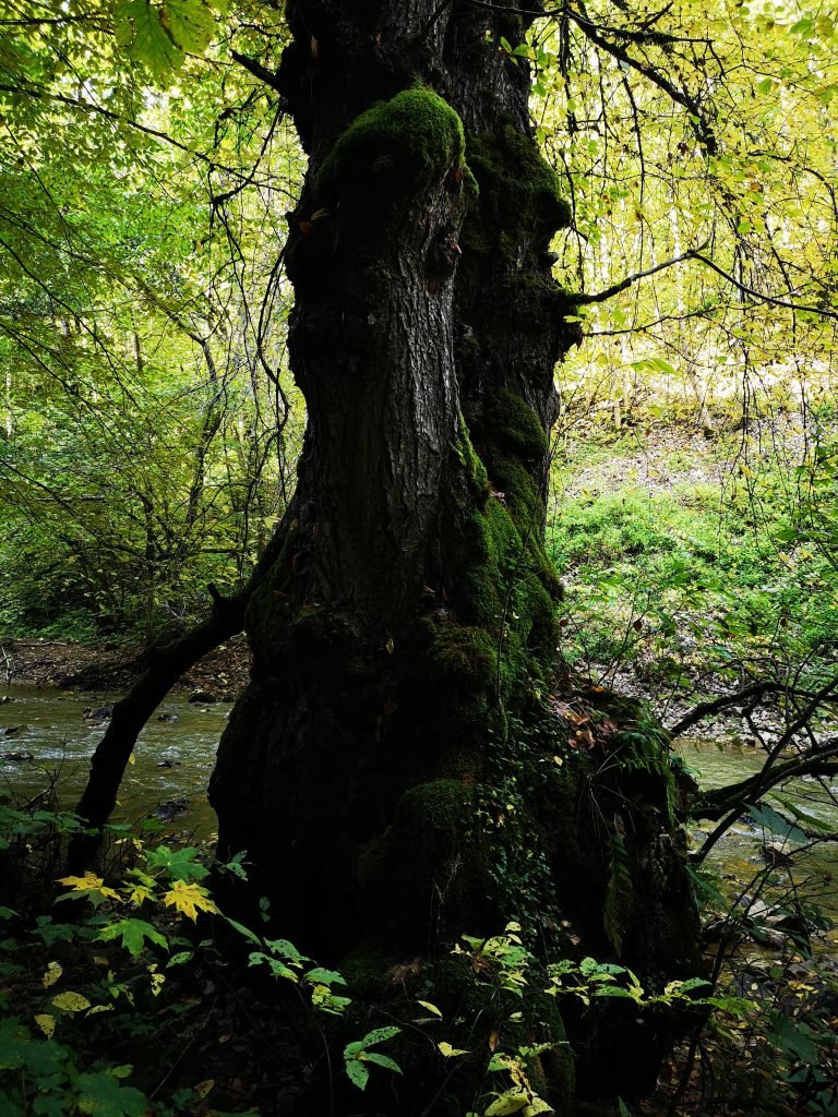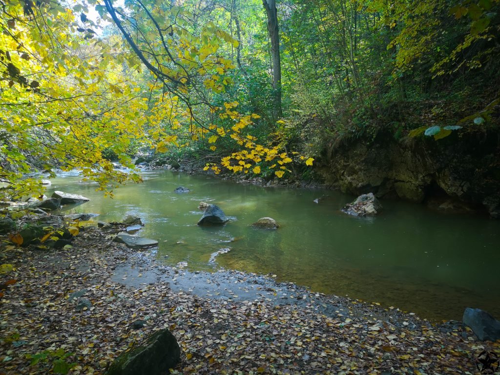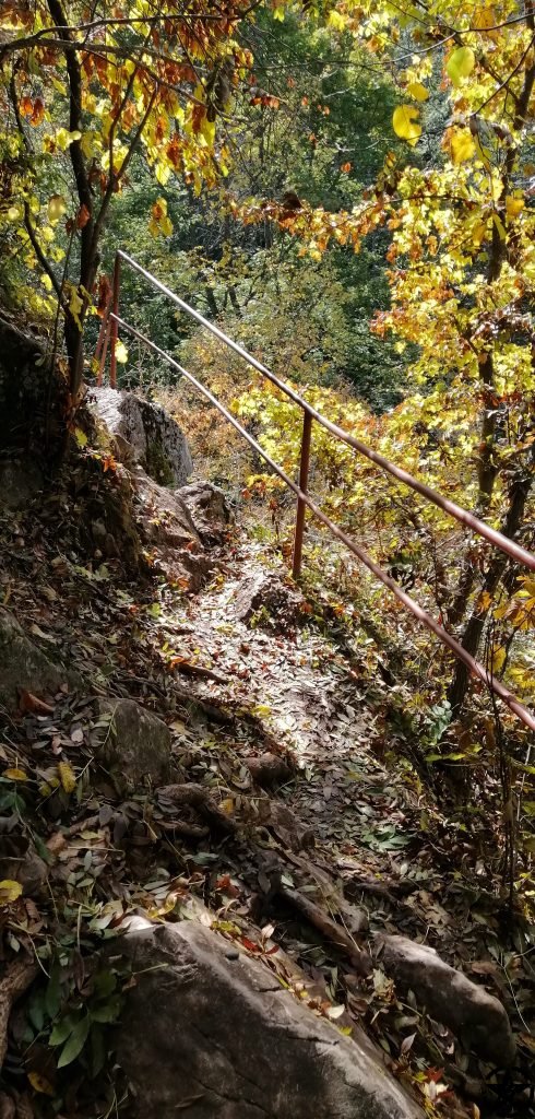 Intram pe poteca lina care merge pe partea stanga a raului. Apa e galben-verzuie iar vremea e placuta. Inaintam si dam de o portiune mai dificila cu lanturi si balustrada, de circa 100 m. Aluneca putin insa incet trecem de ea si ne continuam mersul lin prin padurice.