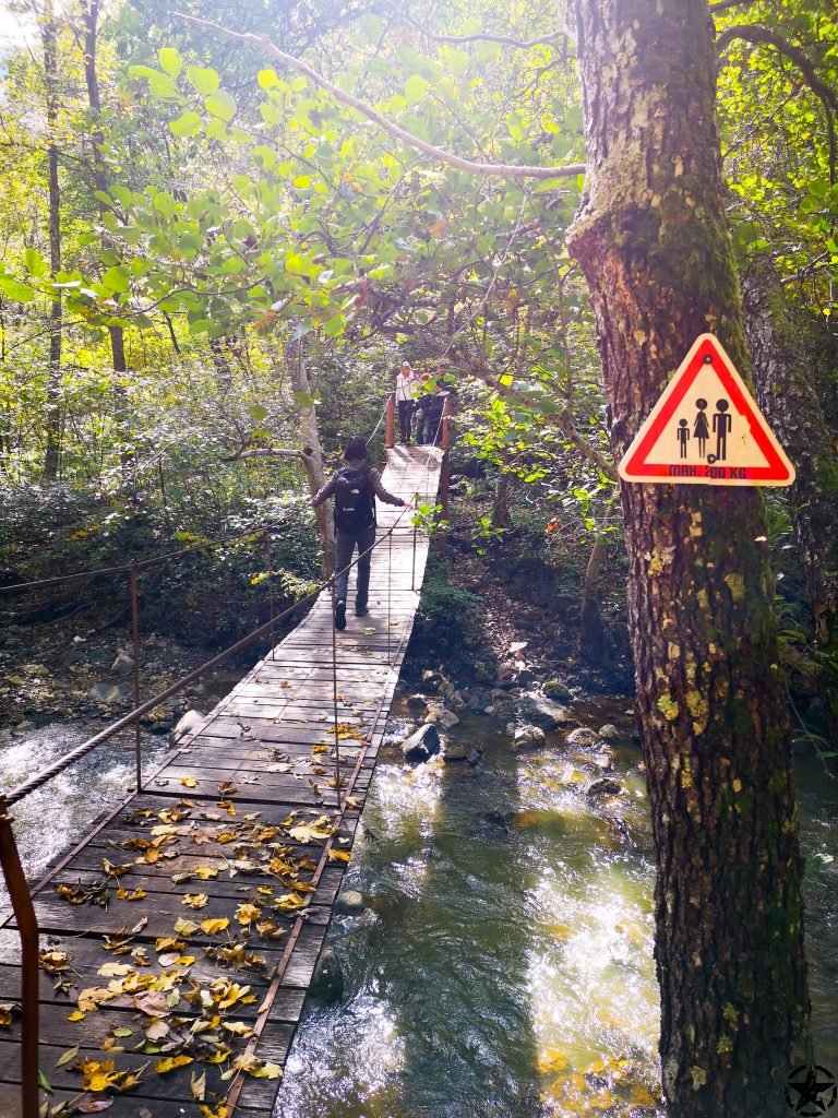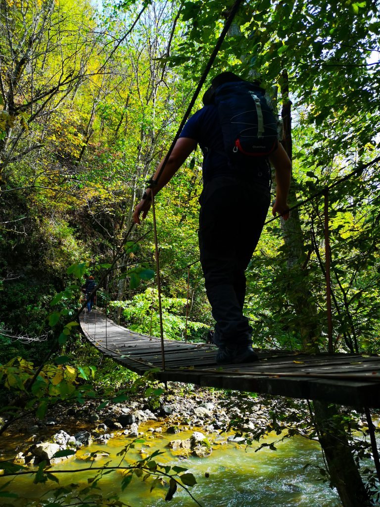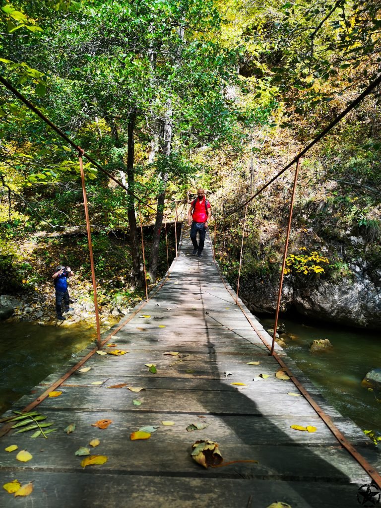 Dupa putin mers lin ajungem la prima surpriza: un podet suspendat peste rau. Pentru siguranta trecem cate unul podul. E o senzatie amuzanta data de balans amestecata cu putina teama insa trecem fara probleme.