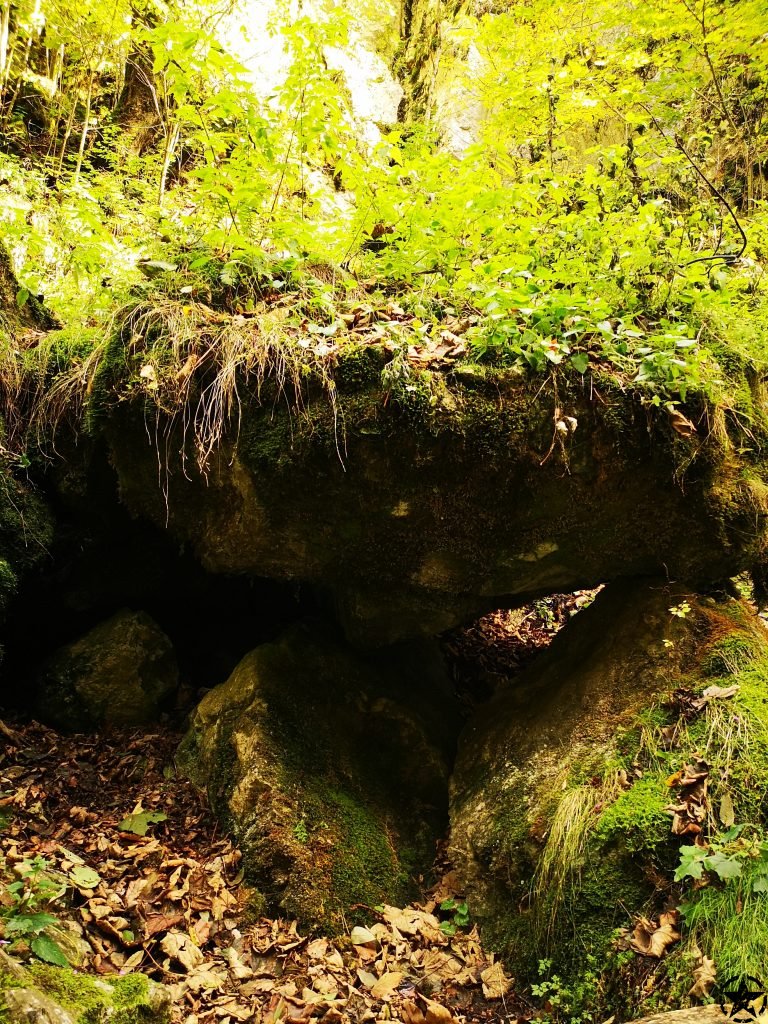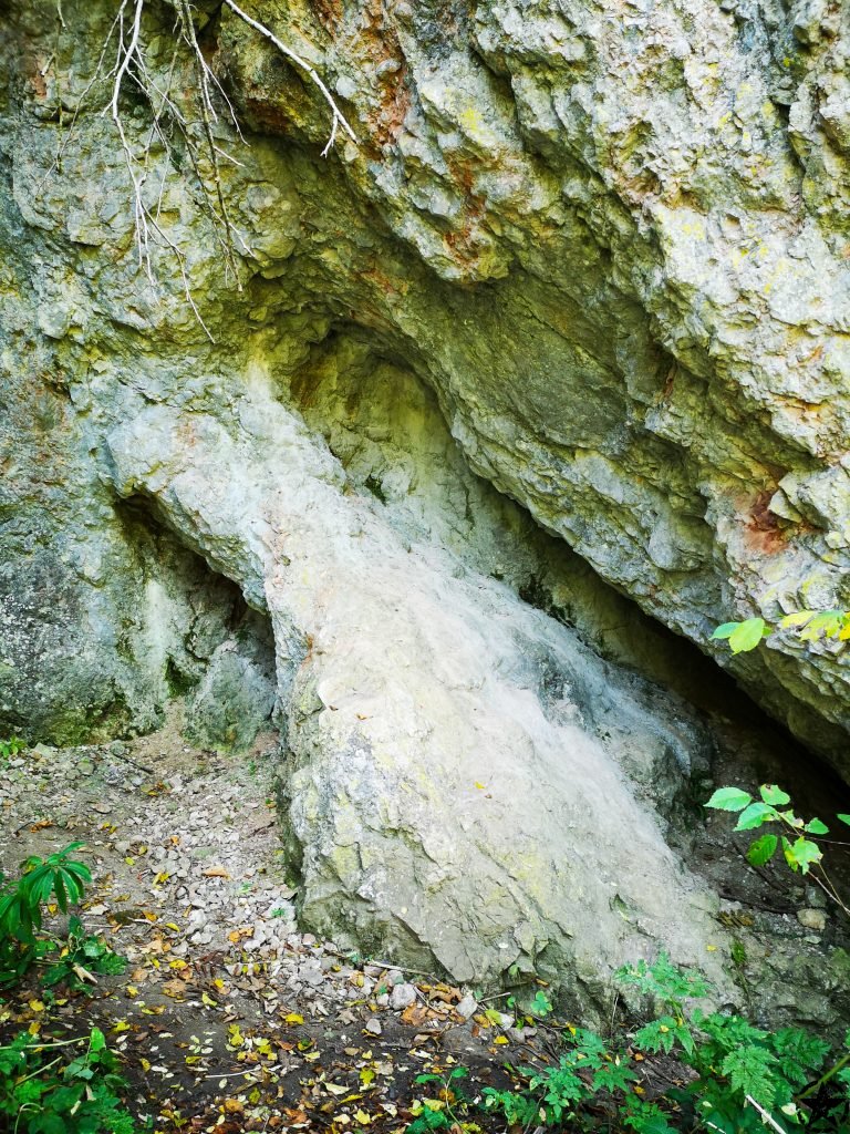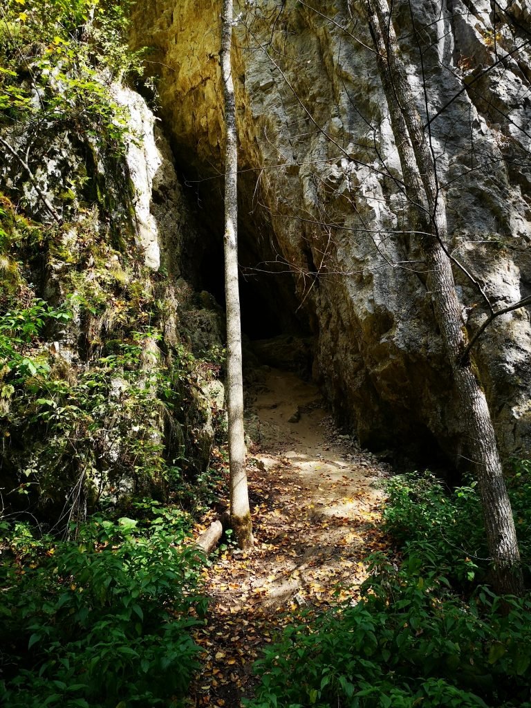 Poteca lina acoperita cu un covor plapand de frunze se continua pana dam de primele caverne mici in stanca.